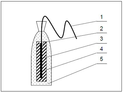 Рис.1. Строение анода: 1 – электрический кабель; 2 - соединение изоляцией кабель; 3 – Mg цилиндрический анод; 4 - стальной сердечник; 5 - засыпка в хлопчатобумажном мешке.