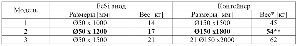 Таблица 1. Спецификация ферросилидового анодного электрода контейнерного типа
