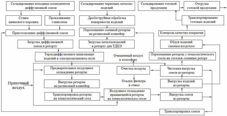 Таким образом, технологический процесс термодиффузионного цинкования металлоизделий в электромагнитном поле, в общем виде можно представить в виде последовательности следующих основных технологических операций: